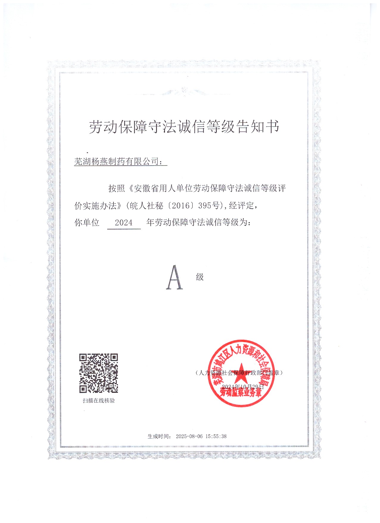 公司重視藥品質(zhì)量體系及人才隊(duì)伍建設(shè),連續(xù)4年被原蕪湖市食品藥品監(jiān)督管理局表彰為“安全誠(chéng)信示范單位”;連續(xù)8年被評(píng)為用人“A”級(jí)(最高級(jí))勞動(dòng)保障誠(chéng)信用人單位;連續(xù)5年納稅信用等級(jí)被評(píng)為A級(jí);2020年當(dāng)選蕪湖市藥學(xué)會(huì)書(shū)記兼秘書(shū)長(zhǎng)單位;2021年被授予蕪湖市“三八紅旗集體”榮譽(yù)稱(chēng)號(hào);2022年當(dāng)選鳩江區(qū)工商聯(lián)副主席單位,并被評(píng)為優(yōu)秀會(huì)員企業(yè)。